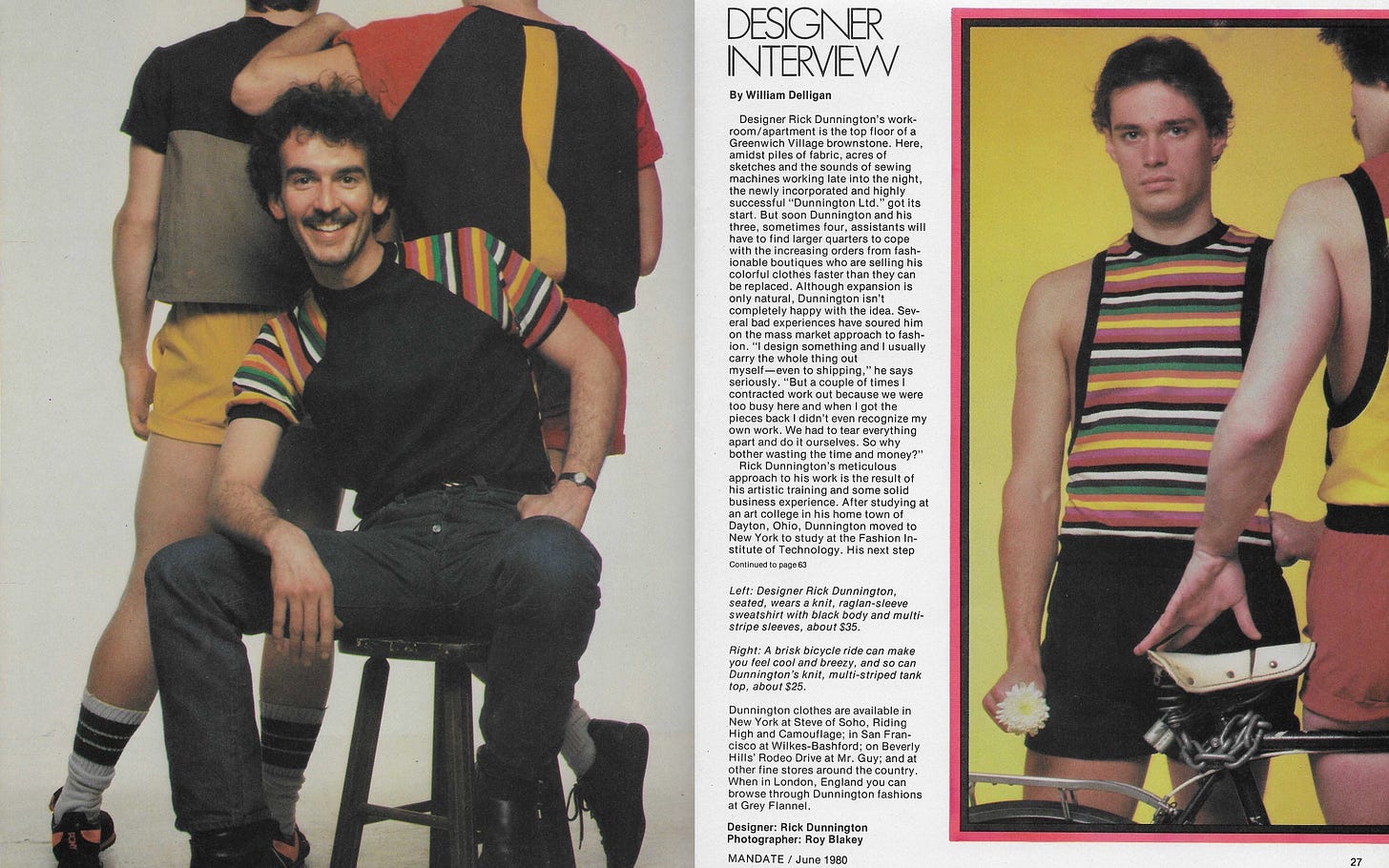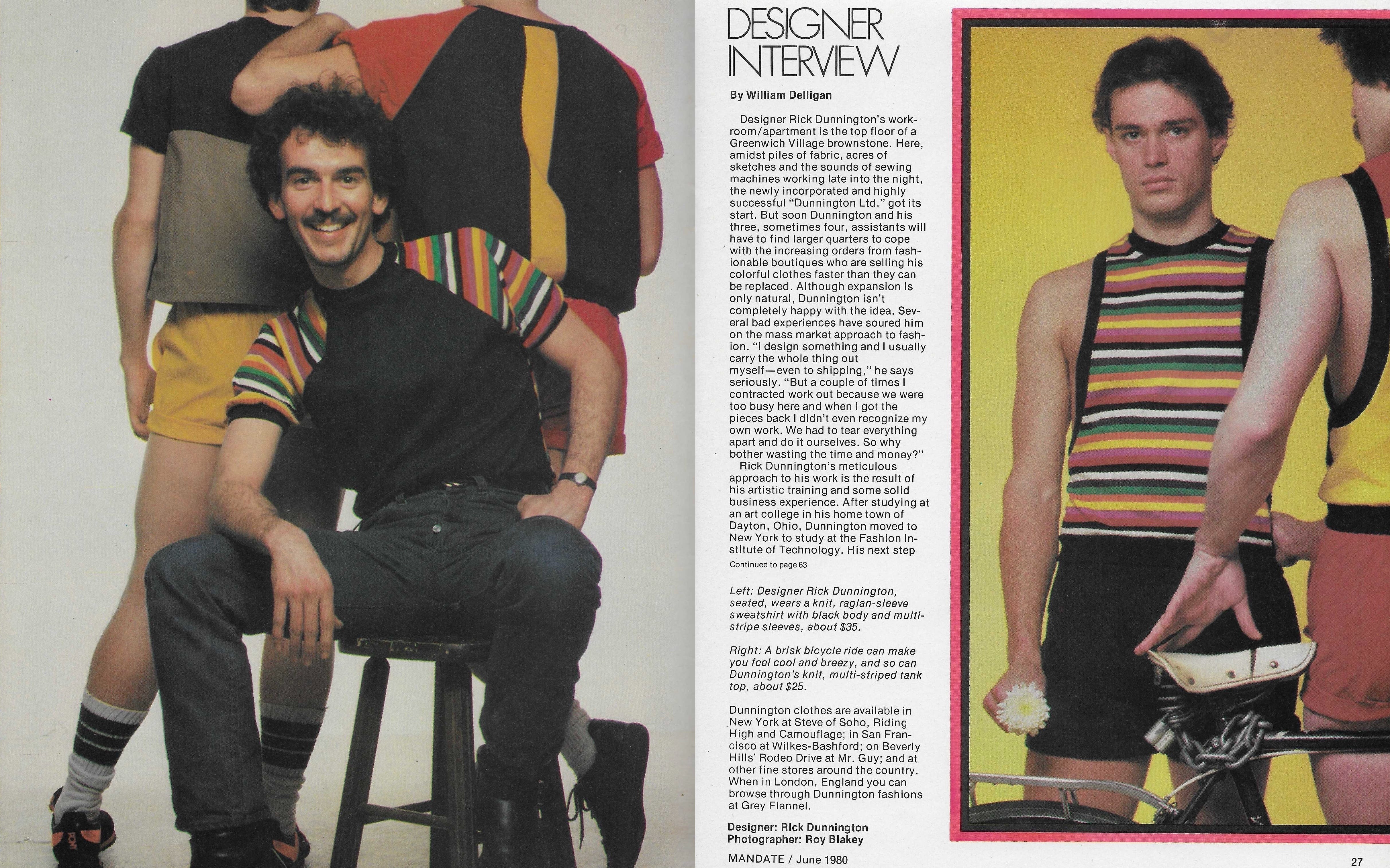 Designer Interview by William Delligan: Designer Rick Dunnington’s workroom/apartment is the top floor of a Greenwich Village brownstone. Here, amidst piles of fabric, acres of sketches, and the sounds of sewing machines working late into the night, the newly incorporated and highly successful “Dunnington Ltd.” got its start. But soon Dunnington and his three, sometimes four, assistants will have to find larger quarters to cope with the increasing orders from fashionable boutiques that are selling his colorful clothes faster than they can be replaced. Although expansion is only natural, Dunnington isn’t completely happy with the idea. Several bad experiences have soured him on the mass market approach to fashion. “I design something and I usually carry the whole thing out myself-even to shipping,” he says seriously. “But a couple of times! contracted work out because we were too busy here, and when I got the pieces back, I didn’t even recognize my own work. We had to tear everything apart and do it ourselves. So why bother wasting the time and money?”